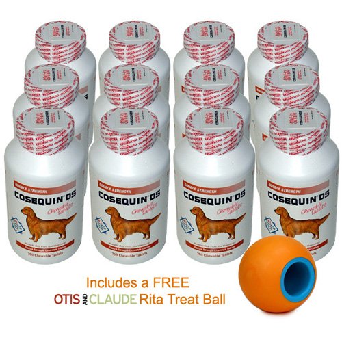 Buy the 12 Pack of Cosequin for maximum saving and FREE shipping AND one FREE Otis and Claude Rita Ball. This double strength formulation is intended for larger dogs 25 lbs and over. Recommendation as a Supplement The Initial Administration Period is 6 Weeks. Most animals should respond within this period. Improvement on Cosequin can range from gradual to dramatic. If the improvement is gradual, it may go unnoticed by the owner. It is therefore important to keep the animal at the initial amount for at least 6 weeks before deciding to discontinue the use of Cosequin. If there is gradual improvement and Cosequin is discontinued, a regression of clinical status can occur. Effective alternative available for only $299.99 (1500 Tablets)--> [ More Information ] $120 mail-in rebate with purchase of 12 PACK Cosequin 250 Count Chewables. Form included on bottle tops.--> Ingredients: Glucosamine hydrochloride (derived from shellfish), sodium chondroitin sulfate (derived from bovine cartilage), microcrystalline cellulose, artificial roast beef flavor, manganese ascorbate, natural and artificial cheese flavor, mixed glycosaminoglycans, dried brewers yeast, magnesium stearate, and natural garlic flavor. Guaranteed Analysis: (Contained in each Tablet) Glucosamine HCL min. 500 mg Sodium Chondroitin Sulfate min. 400 mg Manganese (Ascorbate) min. 5 mg It is therefore important to keep the animal at the initial amount for at least 6 weeks before deciding to discontinue the use of Cosequin. If there is gradual improvement and Cosequin is discontinued, a regression of clinical status can occur.